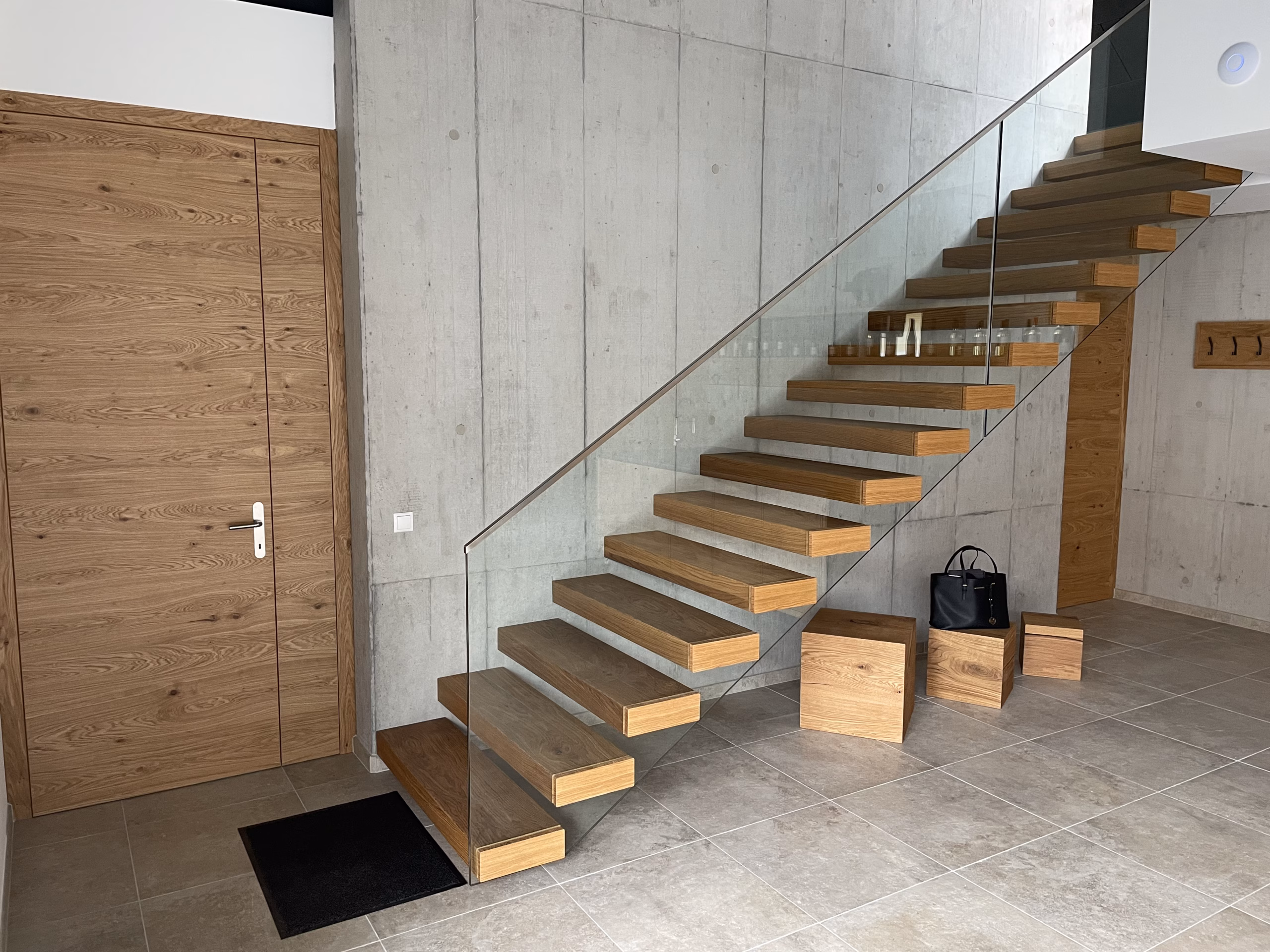 Eine Kragarmstiege besticht durch ihre freitragende Konstruktion, bei der die Stufen unsichtbar in einer stabilen Beton- oder Holzwand verankert sind. Dadurch entsteht der Eindruck, die Treppe schwebe schwerelos im Raum.
