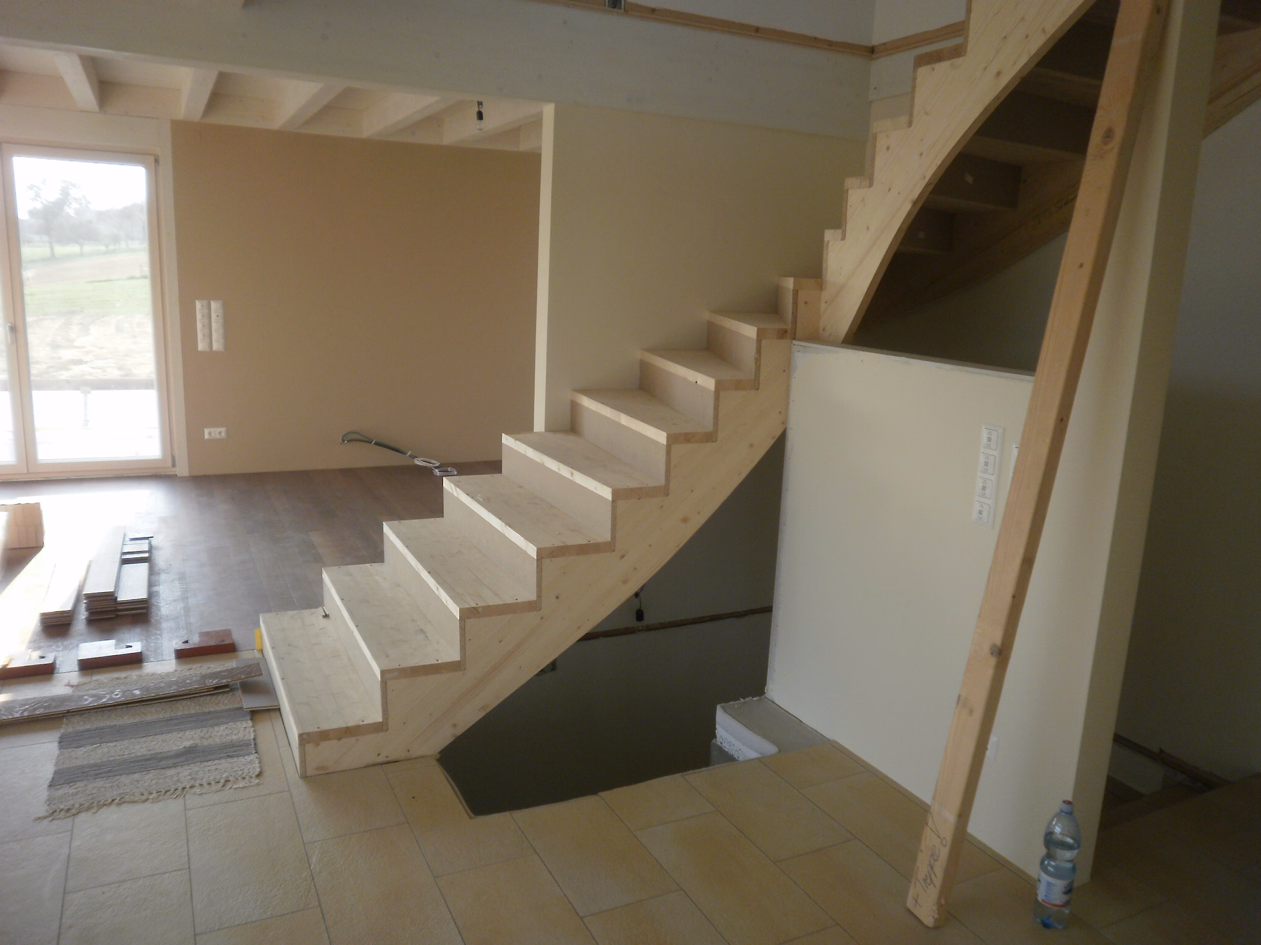 Eine Rohbaustiege aus Holz ist die praktische Wahl während der Bauphase. Sie wird fest verklebt, ist sofort begehbar und überzeugt durch Stabilität ohne Knarr- oder Quietschgeräusche.